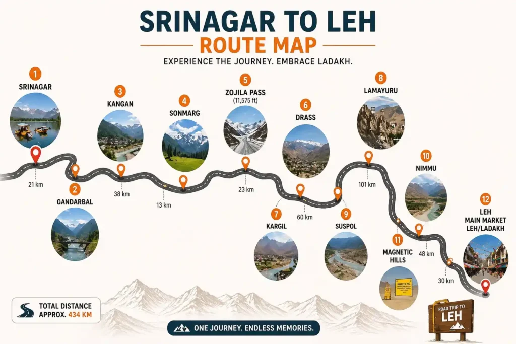 The total distance from Srinagar to Leh is approximately 434 km. The journey is almost always split across two days with an overnight halt at Kargil. Day 1 (Srinagar to Kargil) takes approximately 6–7 hours covering 204 km. Day 2 (Kargil to Leh) takes approximately 5–6 hours covering 230 km. Total travel time is about 11–13 hours of actual driving, but the multi-day format with sightseeing stops makes the experience far more enjoyable and safe.